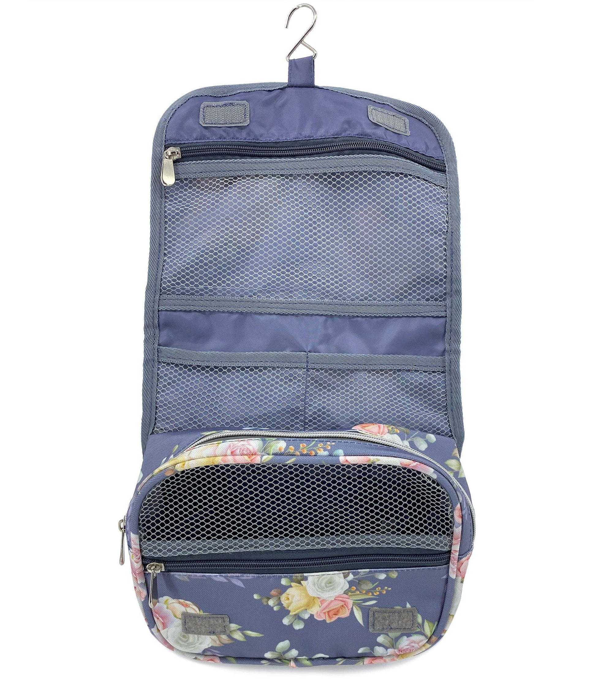 Features a romantic, floral rose print with 3 zippered compartments and 6 pockets to keep all of your toiletry items organised. While the handle strap makes it easy to carry and has a handy hook so you can hang it up and easily access your toiletries. When not in use, it folds up and stays closed with velcro fastenings.
