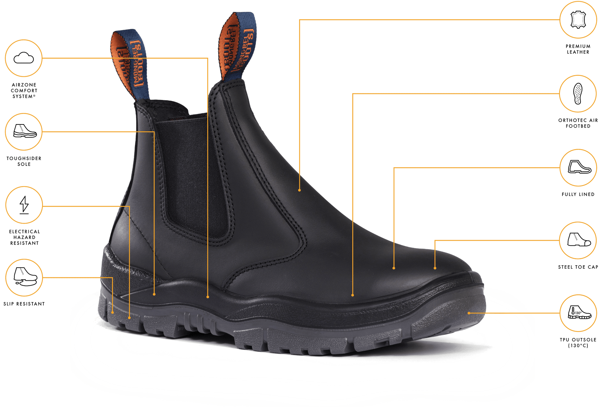 200J steel toe capAirZone® Comfort SystemElectrical hazard resistantSlip, oil & fat resistant TPU/PU ToughSider soleOrthoTec Air footbed w/ anatomical arch supportChelsea cut upperCoats Nylbond stitchingPremium full grain leather