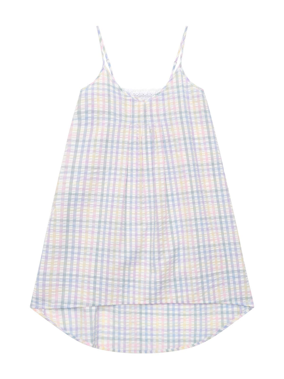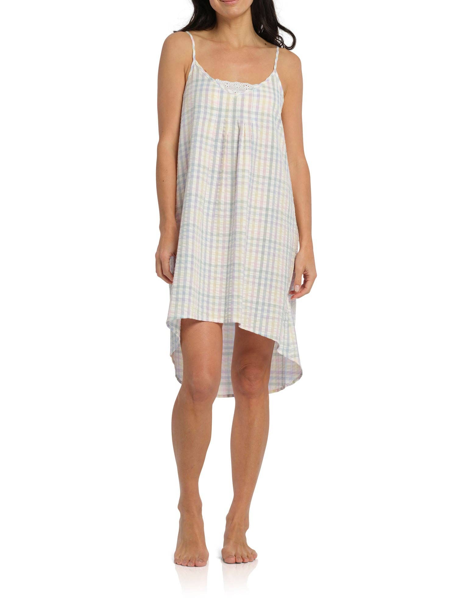 Graced by a dreamy pastel gingham print, this women's chemise features adjustable straps for a tailored fit, a pleated front detail, an elasticated back for ultimate comfort, and a high-low hem to keep you elegantly covered.